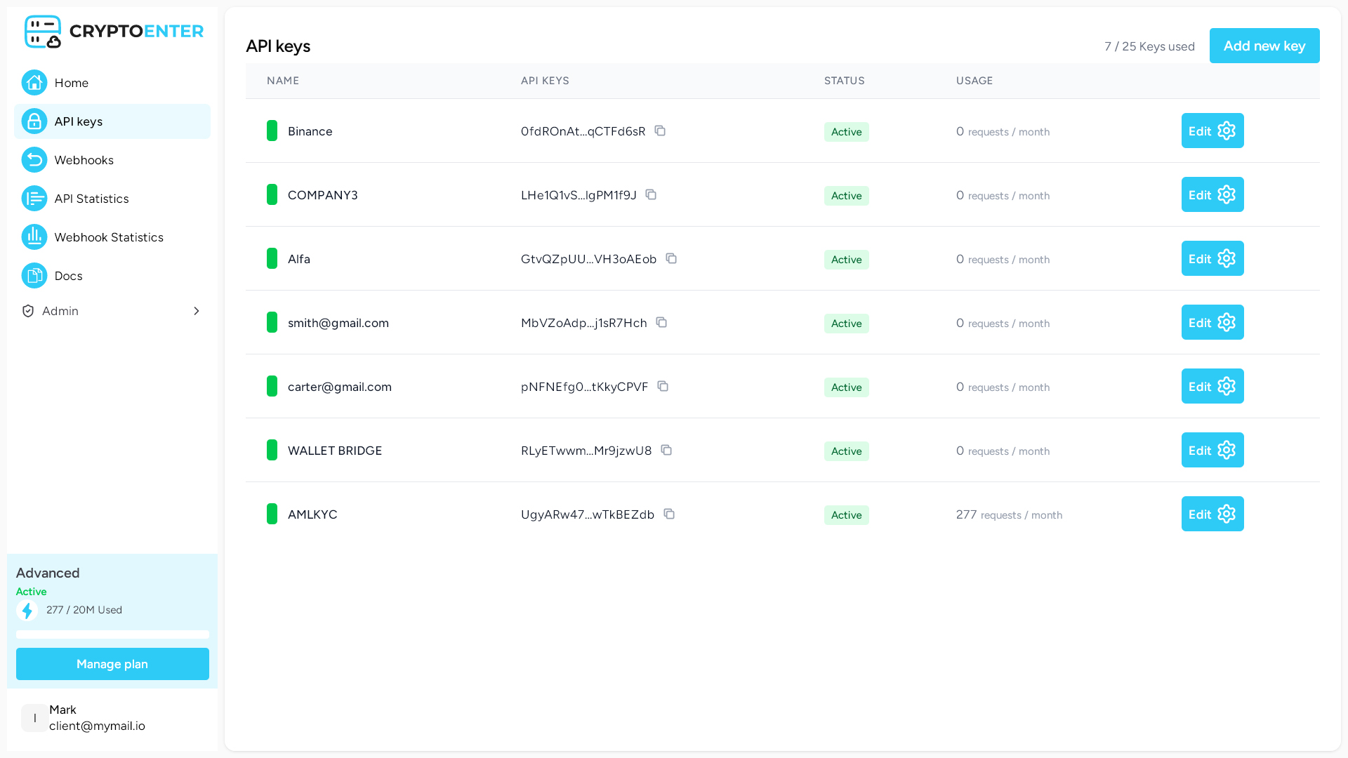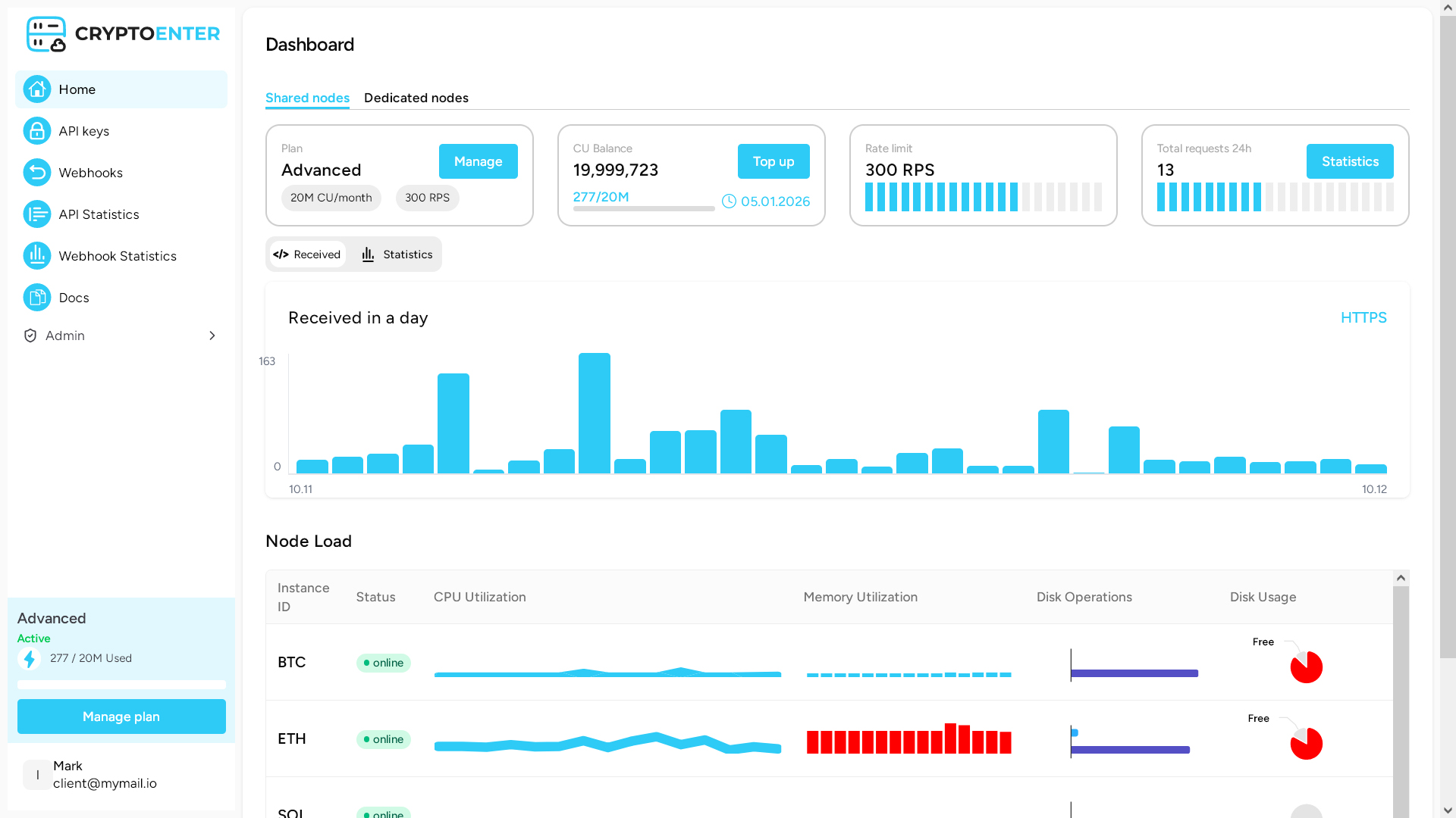 Once you've created an account and signed in, you'll be directed to the CryptoEnter Dashboard. Here, you can create endpoints, monitor your usage plan, and access statistics.